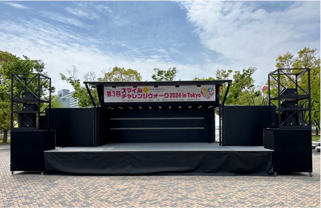 障害者と健常者の交流イベント「スマイルチャレンジウォーク」にて、4tステージトラックType-Lを導入。公園内に進入できるサイズながら高さと面積を確保し、高い視認性で来場者の注目を集めました。音響も会場全体に届きやすく、イベント内容が伝わりやすい点が評価され、継続活用いただいている事例です。