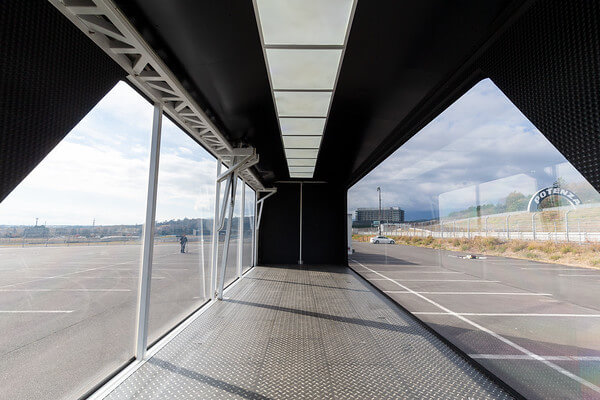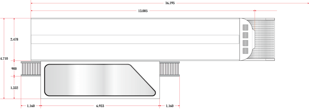 スケルトントレーラーとは、トレーラー部の両側面が7m×2.2mのアクリル仕様となった、開閉式の大型プロモーショントレーラーです。両面を大きなアクリルにすることは強度や構造的に難しく、弊社の技術の粋を集めたオリジナル車両です。全長約17mのスケール感と高い視認性を活かし、「走る広告」として強いインパクトを生み出します。