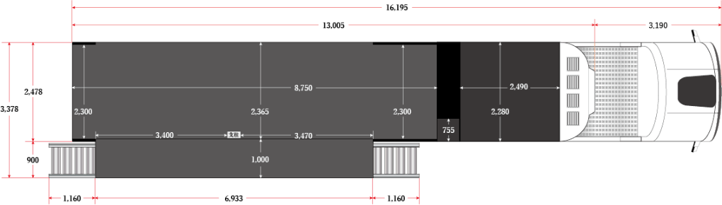 ご要望に合わせて、広告音声や音楽、外部ネオンや室内照明にもカスタマイズ可能です。また、トラクター(トレーラーヘッド)のメーカー変更も可能です。
