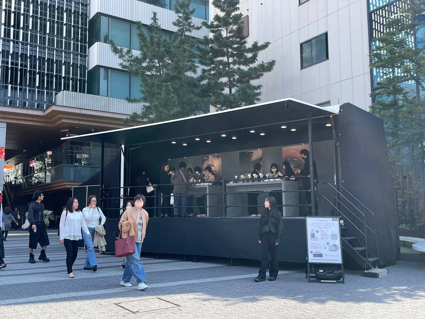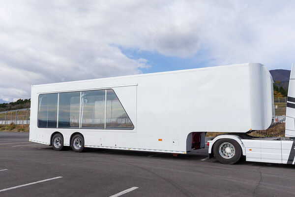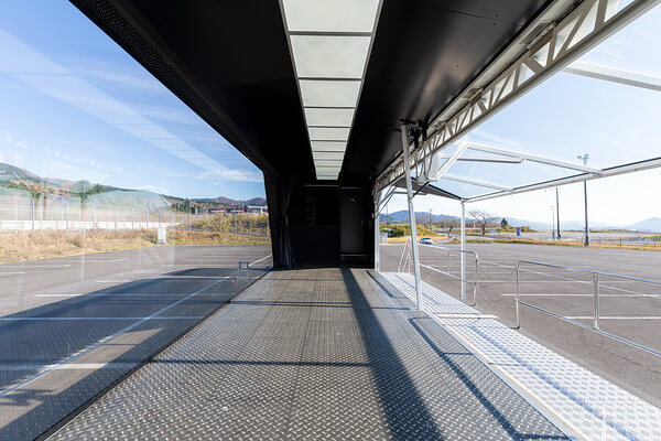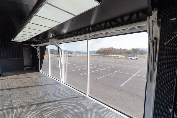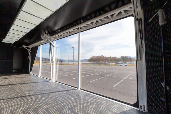 プロモーショントラックのスケルトントレーラーは、トレーラー内部に展示物を設置したり、ボディ全体にラッピングを施すことで、移動中そのものが広告・宣伝効果を発揮します。街中や幹線道路、イベント会場への移動時も、ブランドや商品の認知拡大に貢献します。さらに、トレーラー側面は開閉式構造となっており、停車時には全天候型のイベントスペースとして活用可能です。屋外イベントでありながら、天候に左右されにくい点も大きな特長です。