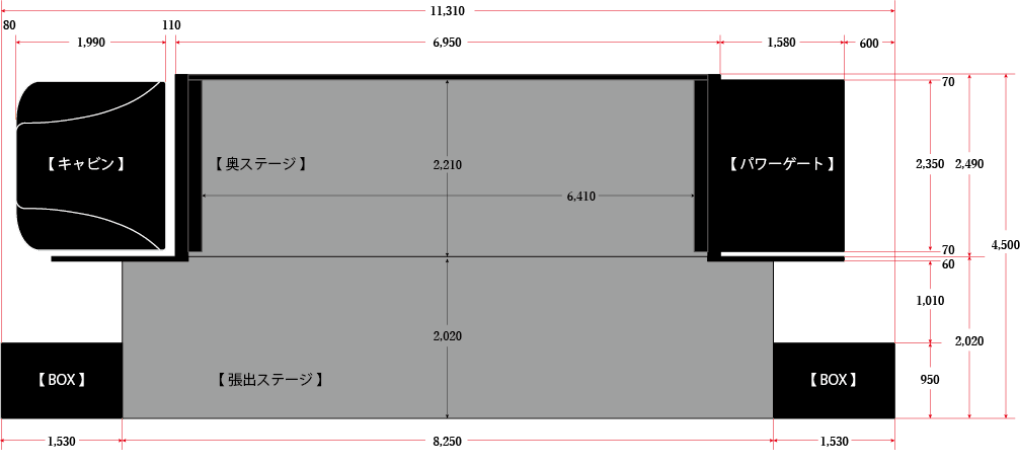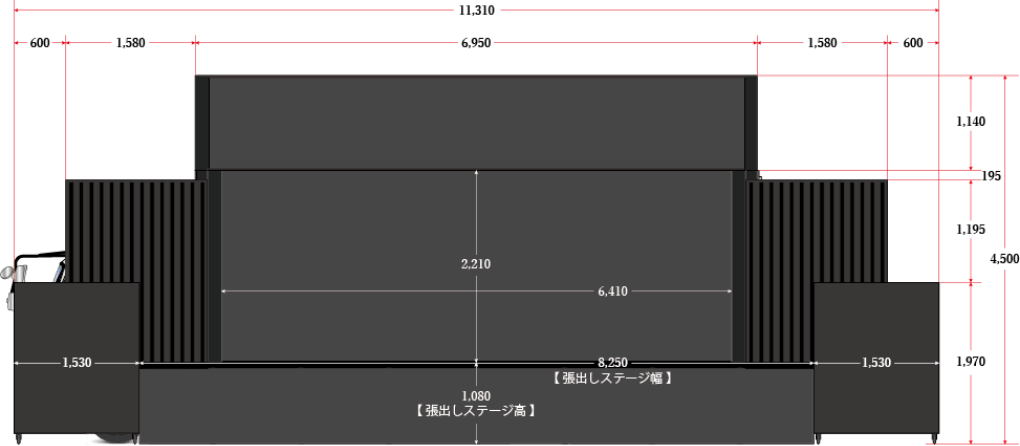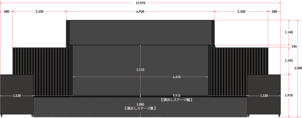 ステージ幅は約9.9m、奥行きは約4.2m。多数の出演者が同時に登壇するイベントでも余裕をもって使用でき、機材や演出装置を配置した場合でも動線を確保しやすい設計となっています。観客からの視認性も高く、会場全体に一体感を生み出します。