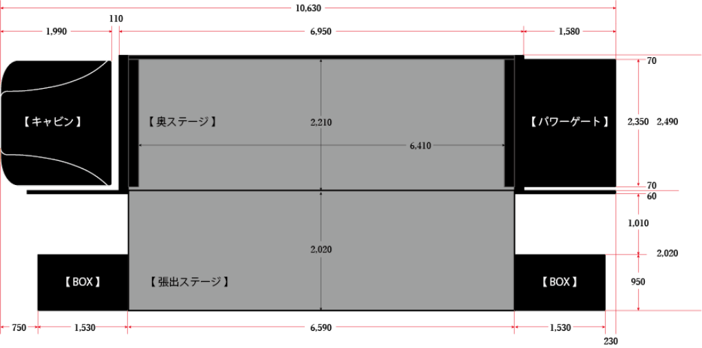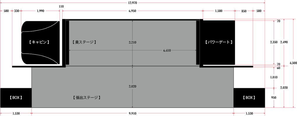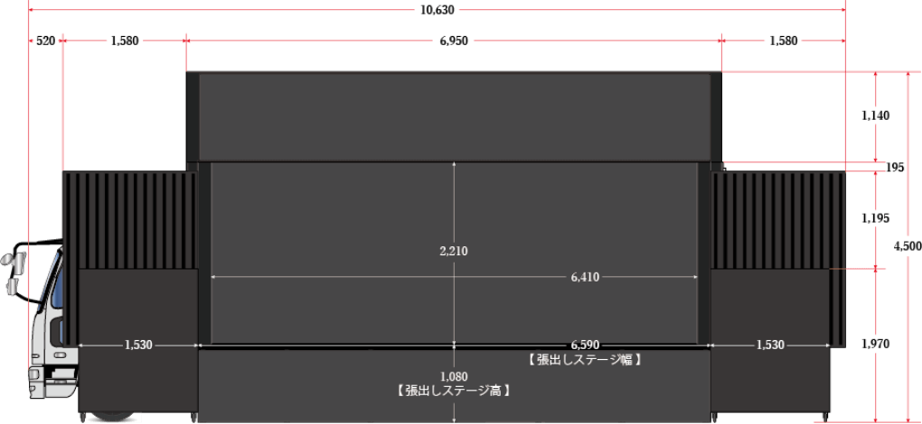 10t(大型)Type-Mは、4t(中型)Type-Lと同等クラスのステージ幅を確保しながら、10t車両ならではの奥行き・天井高・演出耐性を最大限に活かした、演出重視のステージトラックです。