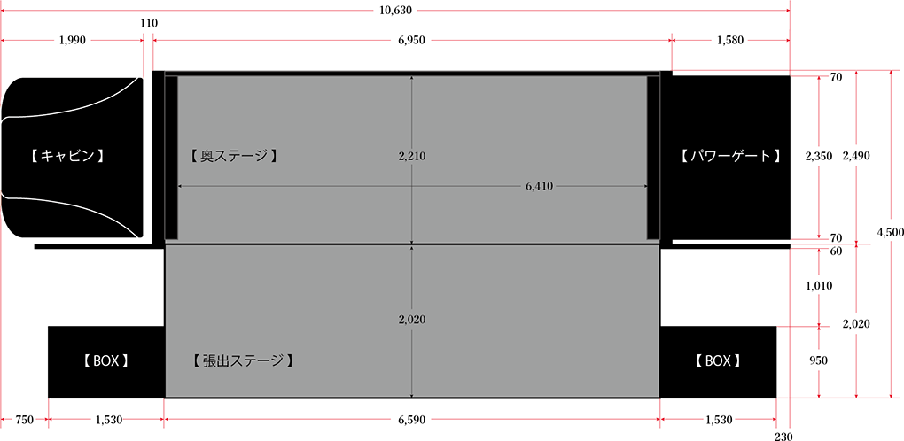 10t(大型)Type-Lは、弊社が誇る、最も大きいフラッグシップモデルです。ステージサイズ(張り出しステージ幅)は 約13.8m、奥行き 約5mの圧倒的なサイズは、来場者に強烈なインパクトを与えます。