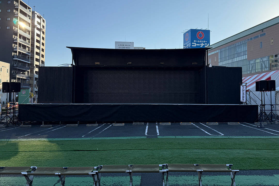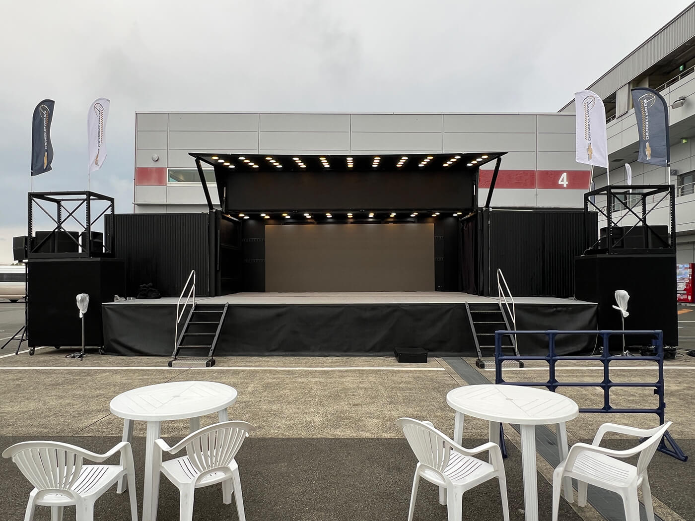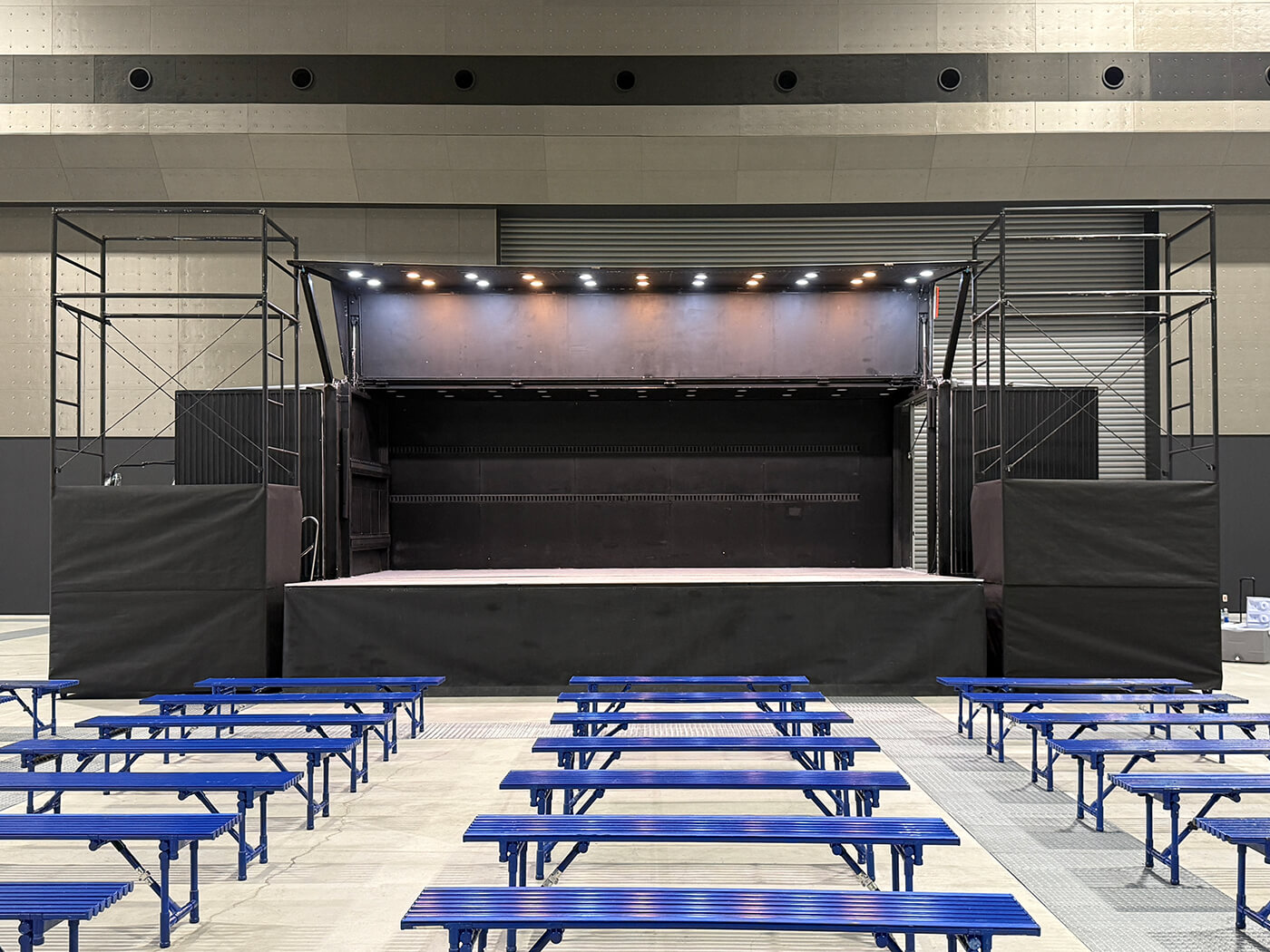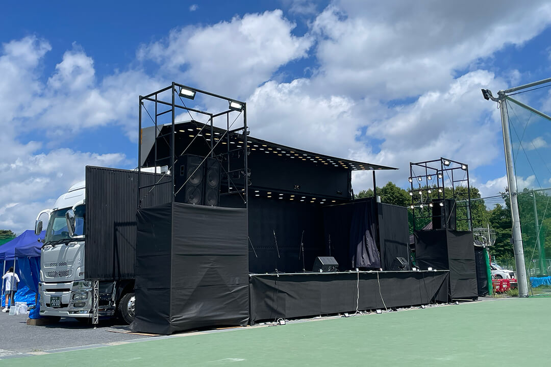 また、照明設備や音響機材にも対応しており、小規模イベントでも高い演出効果を実現。大掛かりな重機や長時間の設営を必要とせず、スピーディーにイベントを開始できる点も大きな特長です。