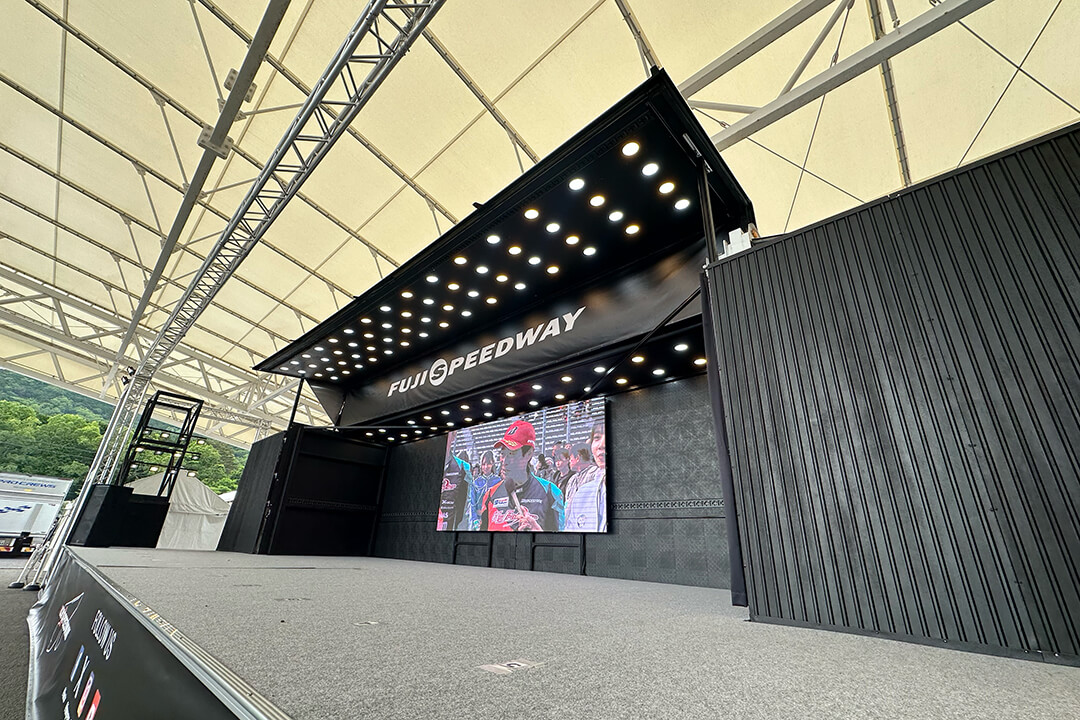 4t車両に比べて奥行きが約80cm長く、天井高も確保されているため、実際のサイズ以上に迫力と存在感があります。広い会場や来場者数の多いイベントに最適で、車両展示など、幅広いシーンで活躍します。ステージサイズ(張り出しステージ幅)は 約9.2m、奥行き 約5m。トークイベント、ライブ、式典、商品発表などに十分な広さを確保しています。標準装備の天井照明の他、オプションで照明設備・音響機材をご用意しているので、高い演出効果を実現します。