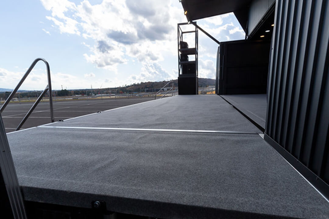 ステージ幅は 約6.6m、奥行きは 約4.2m。コンパクトながらも、トークイベントやミニライブ、式典、商品発表などにも十分な広さを確保しています。ステージ専用車両として設計されているため、安定性と安全性にも優れており、安心してイベントを実施いただけます。
