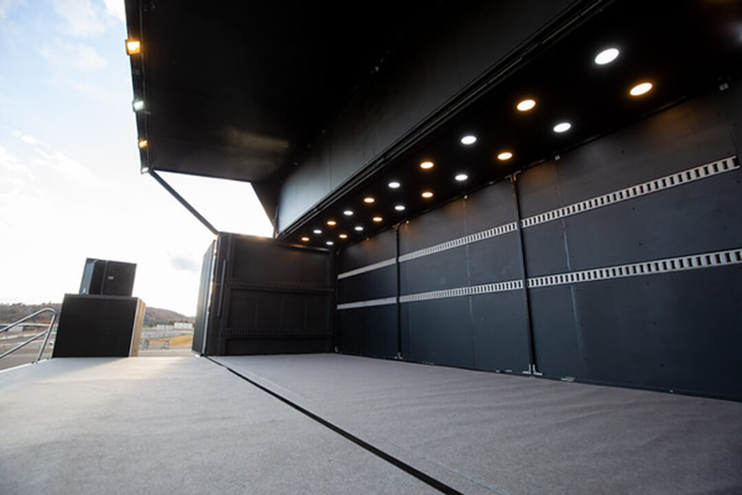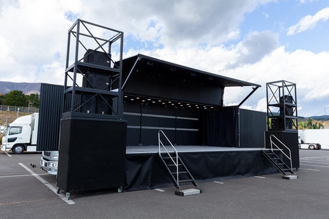 ステージトラックとは、トラックの荷台部分を本格的なステージとして使用できる、イベントステージです。従来のステージ設営に必要な大きな重機は不要で、会場にトラックを 設置・展開するだけで、スピーディーで安全性の高いステージ空間を構築できます。