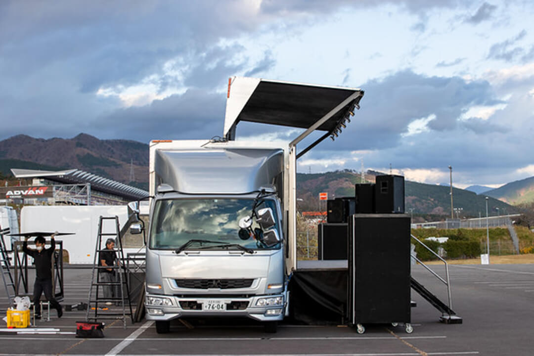 トラックの荷台部分を本格的なステージとして使用できる、イベント専用の車両です。設営・撤収が短時間で行え、安全性と演出性を兼ね備えたステージ空間を構築できます。